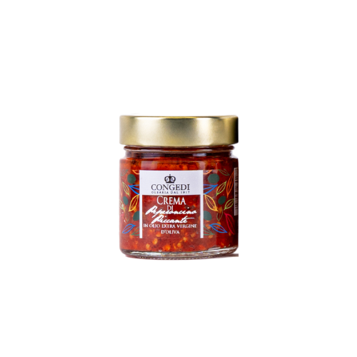 Salsa a base di peperoncino piccante in olio extra vergine di oliva CONGEDI. Ottima con gli aperitivi e con la pasta. Confezionato in vaso da 220 gr