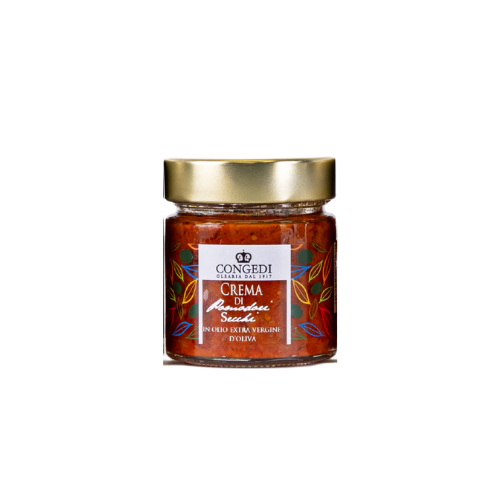 Salsa a base di pomodori secchi in olio extra vergine di oliva CONGEDI. Ottima con gli aperitivi e con la pasta. Confezionato in vaso da 220 gr