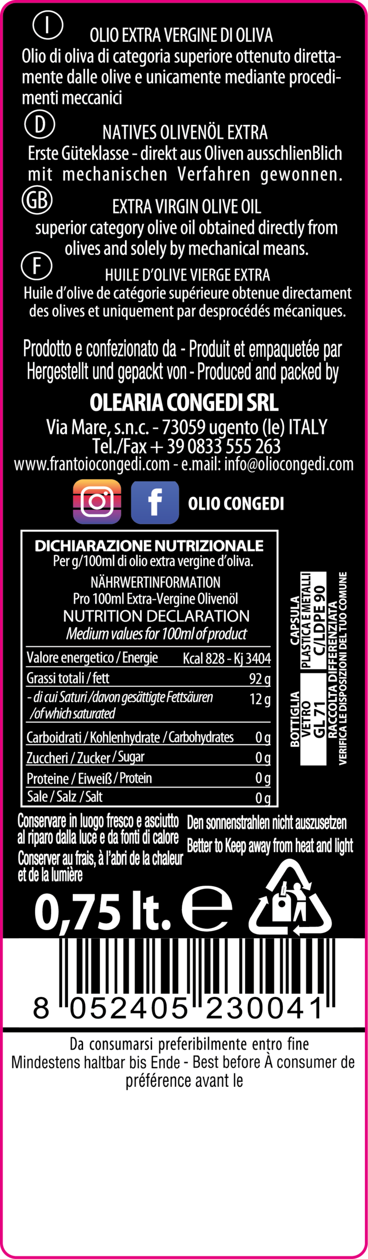 Questo olio extravergine di oliva è un prodotto 100% italiano, confezionato in Puglia con olive del più famoso gusto e qualità.